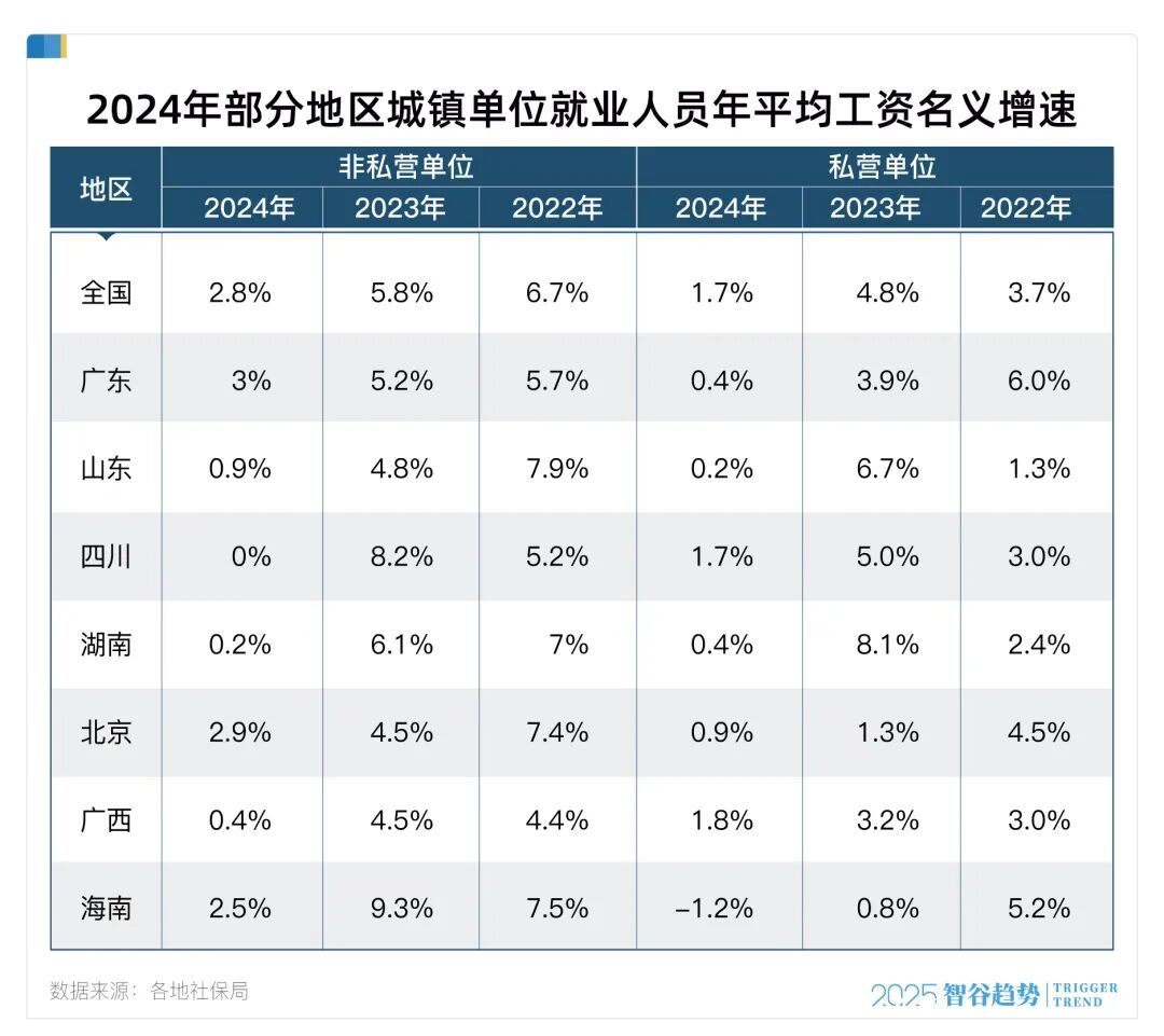 特别是2024年,国内多个省份非私营、私营单位平均工资涨幅相较此前两年出现了较大程度下滑,有部分省份甚至出现了负增长。但相比而言,私营企业工资增速的承压普遍比非私营单位严重。