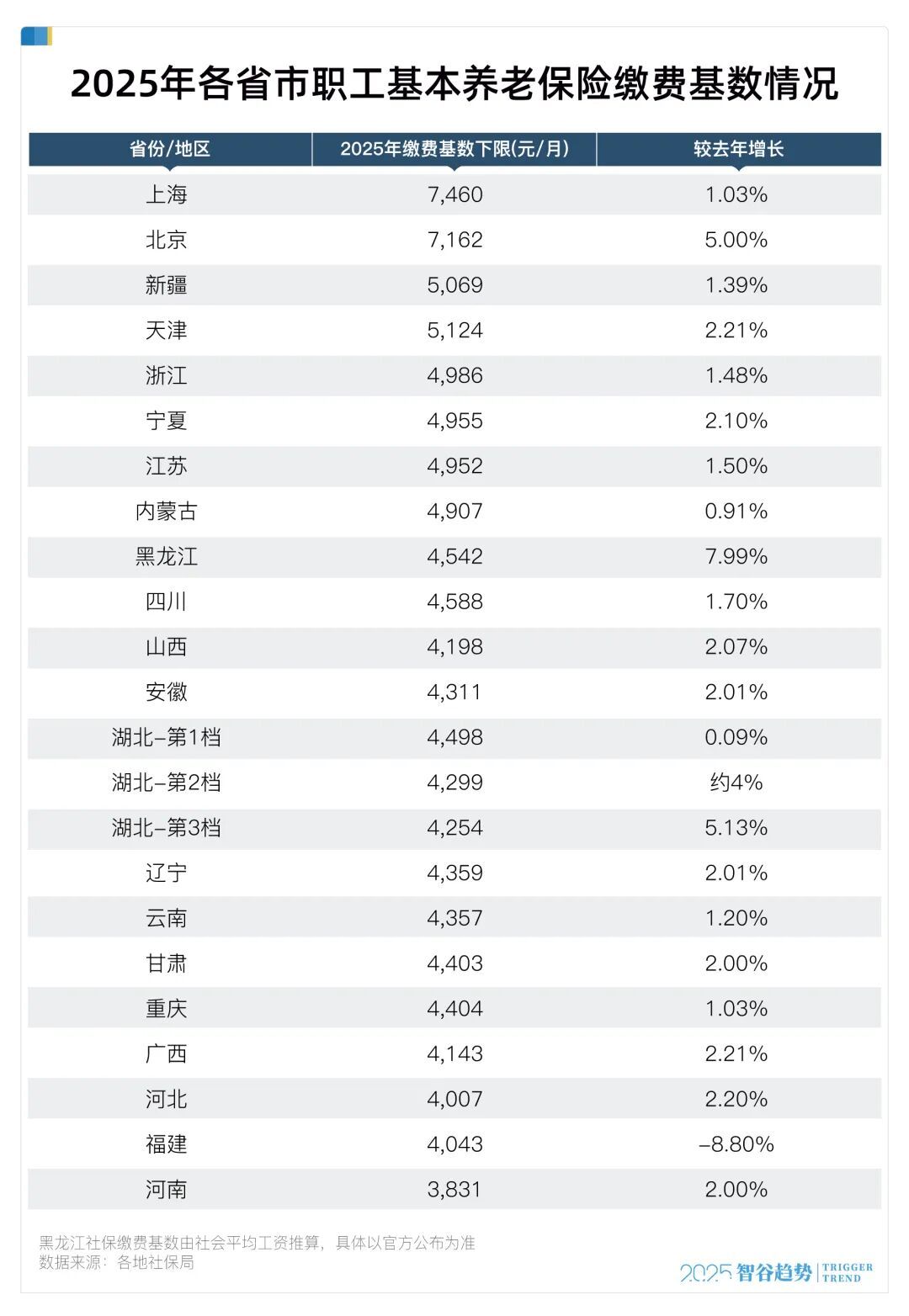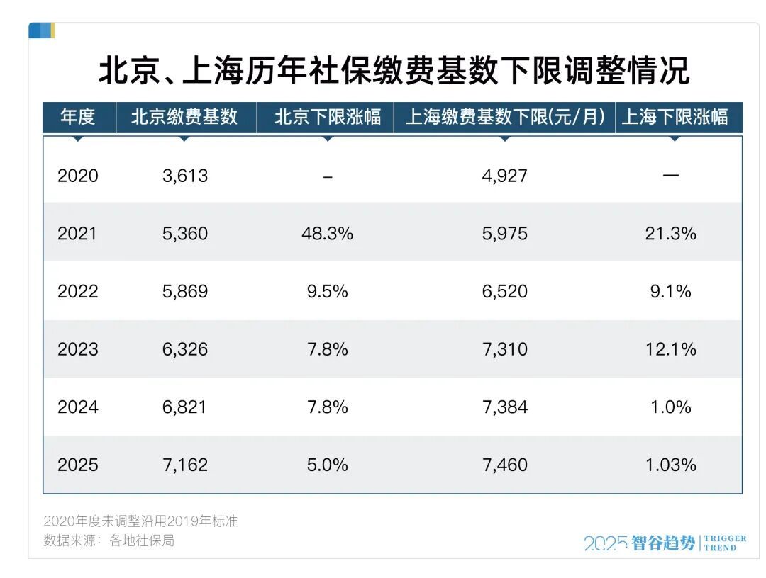 而2025年,北京和上海的基数涨幅都较前几年出现明显下降。北京略高,涨幅接近5%;而上海涨幅只有1.03%,基数下限较去年微涨了74元。